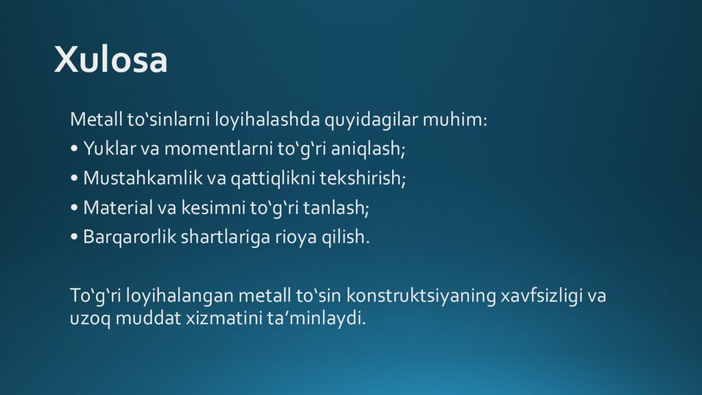 Metall to‘sinlarni loyihalashda quyidagilar muhim : • Yuklar va momentlarni to‘g‘ri aniqlash ; • Mustahkamlik va qattiqlikni tekshirish ; • Material va kesimni to‘g‘ri tanlash ; • Barqarorlik shartlariga rioya qilish. To‘g‘ri loyihalangan metall to‘sin konstruktsiyaning xavfsizligi va uzoq muddat xizmatini ta’minlaydi.