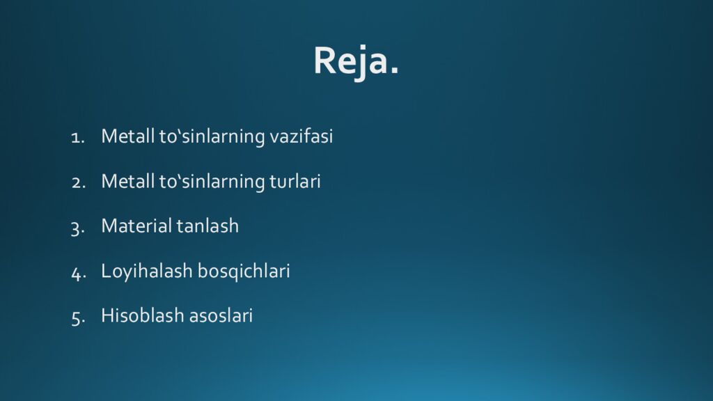 Metall to‘sinlarning vazifasi Metall to‘sinlarning turlari Material tanlash Loyihalash bosqichlari Hisoblash asoslari