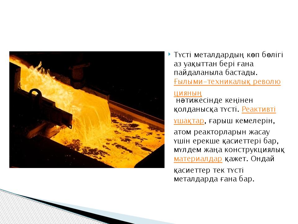 Түсті металдардың көп бөлігі аз уақыттан бері ғана пайдаланыла бастады. Ғылыми-техникалық революцияның нәтижесінде кеңінен қолданысқа түсті. Реактивті ұшақтар, ғарыш кемелерін, атом реакторларын жасау үшін ерекше қасиеттері бар, мүлдем жаңа конструкциялық материалдар қажет. Ондай қасиеттер тек түсті металдарда ғана бар.