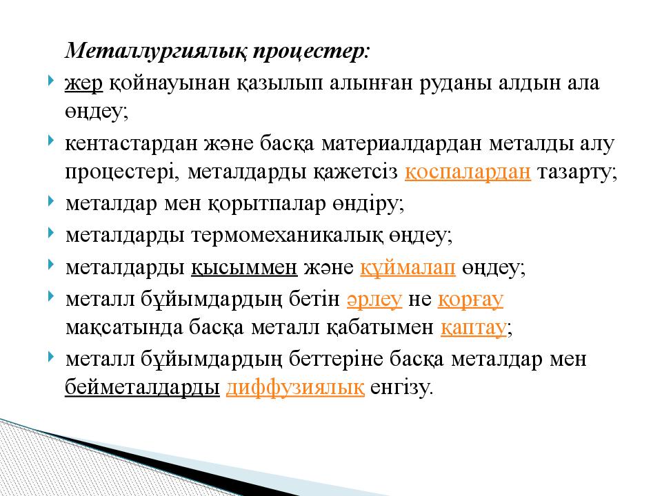 Металлургиялық процестер: жер қойнауынан қазылып алынған руданы алдын ала өңдеу; кентастардан және басқа материалдардан металды алу процестері, металдарды қажетсіз қоспалардан тазарту; металдар мен қорытпалар өндіру; металдарды термомеханикалық өңдеу; металдарды қысыммен және құймалап өңдеу; металл бұйымдардың бетін әрлеу не қорғау мақсатында басқа металл қабатымен қаптау ; металл бұйымдардың беттеріне басқа металдар мен бейметалдарды диффузиялық енгізу.
