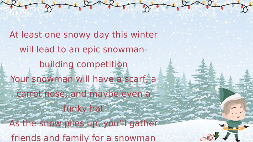 At least one snowy day this winter will lead to an epic snowman-building competition Your snowman will have a scarf, a carrot nose, and maybe even a funky hat As the snow piles up, you’ll gather friends and family for a snowman army that will take over your front yard SONYA UCHILKA