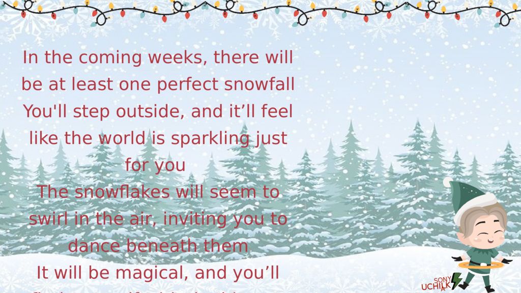 In the coming weeks, there will be at least one perfect snowfall You'll step outside, and it’ll feel like the world is sparkling just for you The snowflakes will seem to swirl in the air, inviting you to dance beneath them It will be magical, and you’ll find yourself with the biggest smile of the season SONYA UCHILKA