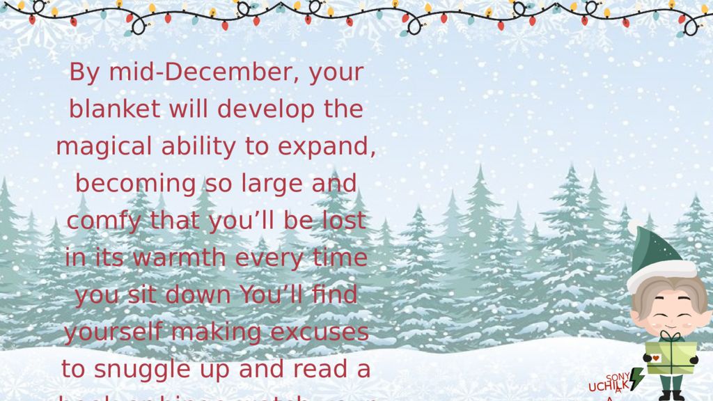 By mid-December, your blanket will develop the magical ability to expand, becoming so large and comfy that you’ll be lost in its warmth every time you sit down You’ll find yourself making excuses to snuggle up and read a book or binge-watch your favorite show SONYA UCHILKA