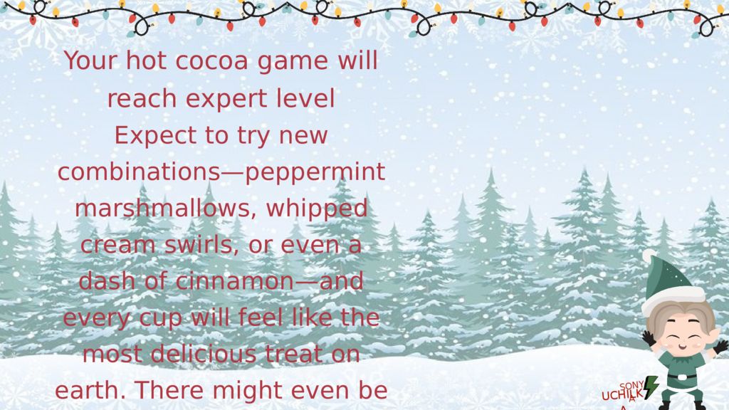 Your hot cocoa game will reach expert level Expect to try new combinations—peppermint marshmallows, whipped cream swirls, or even a dash of cinnamon—and every cup will feel like the most delicious treat on earth. There might even be a spontaneous marshmallow fight at some point! SONYA UCHILKA
