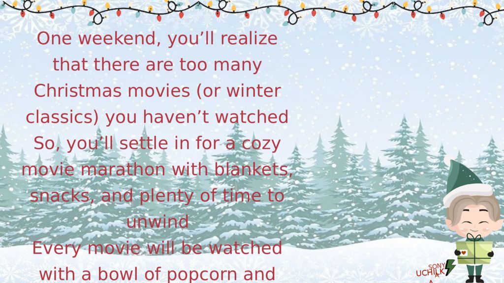 One weekend, you’ll realize that there are too many Christmas movies (or winter classics) you haven’t watched So, you’ll settle in for a cozy movie marathon with blankets, snacks, and plenty of time to unwind Every movie will be watched with a bowl of popcorn and maybe a few "whoops!" when the plot twists you didn’t expect happen SONYA UCHILKA