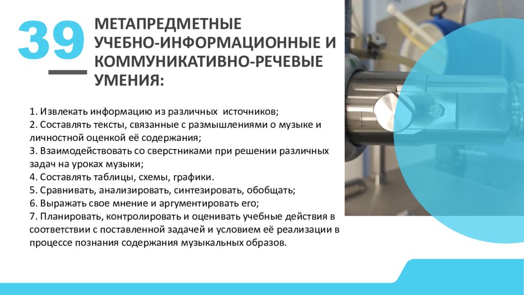 1. Извлекать информацию из различных источников; 2. Составлять тексты, связанные с размышлениями о музыке и личностной оценкой её содержания; 3. Взаимодействовать со сверстниками при решении различных задач на уроках музыки; 4. Составлять таблицы, схемы, графики. 5. Сравнивать, анализировать, синтезировать, обобщать; 6. Выражать свое мнение и аргументировать его; 7. Планировать, контролировать и оценивать учебные действия в соответствии с поставленной задачей и условием её реализации в процессе познания содержания музыкальных образов. 39
