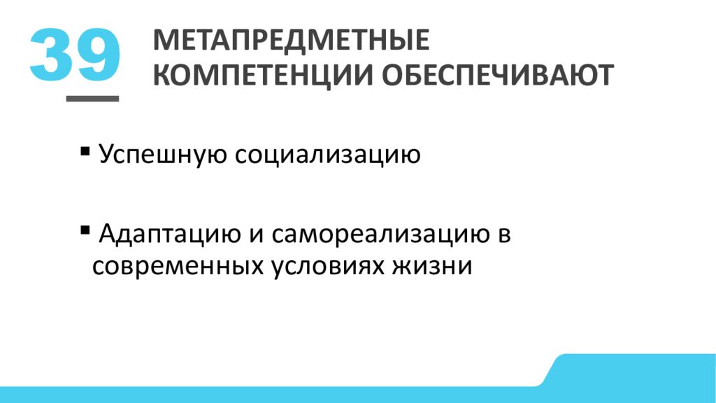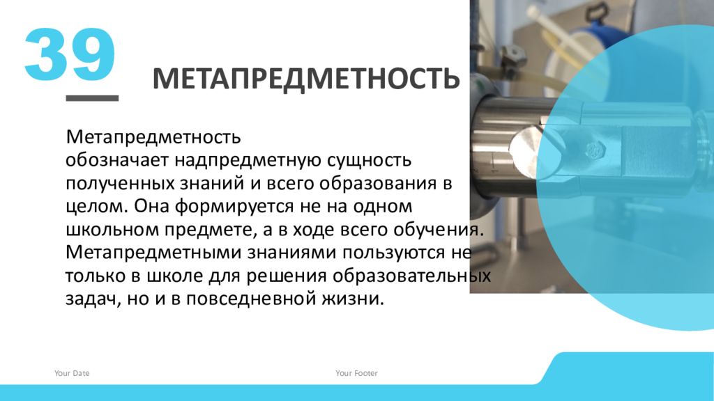 Метапредметность обозначает надпредметную сущность полученных знаний и всего образования в целом. Она формируется не на одном школьном предмете, а в ходе всего обучения. Метапредметными знаниями пользуются не только в школе для решения образовательных задач, но и в повседневной жизни. Your Date Your Footer 39