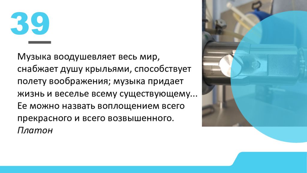 Музыка воодушевляет весь мир, снабжает душу крыльями, способствует полету воображения; музыка придает жизнь и веселье всему существующему... Ее можно назвать воплощением всего прекрасного и всего возвышенного. Платон 39