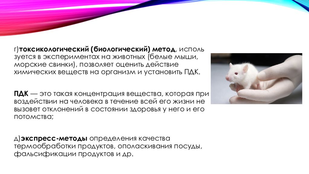 г) токсикологический (биологический) метод, используется в экспериментах на животных (белые мыши, морские свинки), позволяет оценить действие химических веществ на организм и установить ПДК. ПДК — это такая концентрация вещества, которая при воздействии на человека в течение всей его жизни не вызовет отклонений в состоянии здоровья у него и его потомства; д) экспресс-методы определения качества термообработки продуктов, ополаскивания посуды, фальсификации продуктов и др.