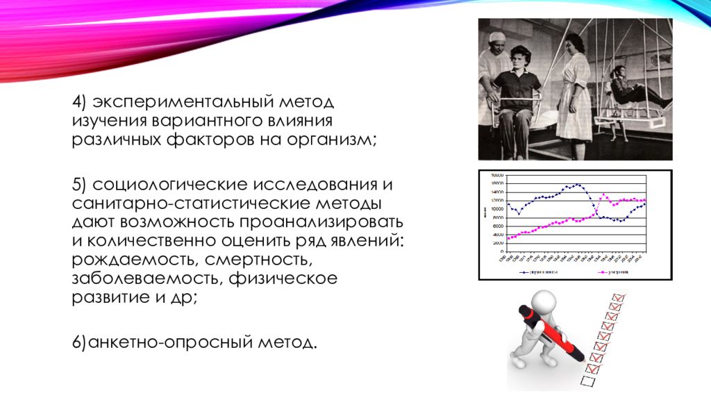 4) экспериментальный метод изучения вариантного влияния различных факторов на организм; 5) социологические исследования и санитарно-статистические методы дают возможность проанализировать и количественно оценить ряд явлений: рождаемость, смертность, заболеваемость, физическое развитие и др ; 6) анкетно -опросный метод.