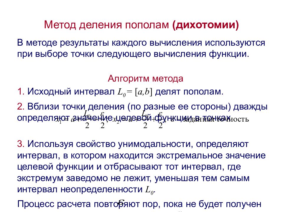 В методе результаты каждого вычисления используются при выборе точки следующего вычисления функции. Алгоритм метода 1. Исходный интервал L 0 = [ а, b ] делят пополам. 2. Вблизи точки деления (по разные ее стороны) дважды определяют значение целевой функции в точках 3. Используя свойство унимодальности, определяют интервал, в котором находится экстремальное значение целевой функции и отбрасывают тот интервал, где экстремум заведомо не лежит, уменьшая тем самым интервал неопределенности L 0. Процесс расчета повторяют пор, пока не будет получен интервал L n, где L n < 2, содержащий точку оптимума.