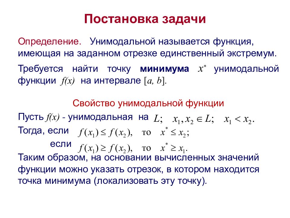 Постановка задачи Определение. Унимодальной называется функция, имеющая на заданном отрезке единственный экстремум. Требуется найти точку минимума x * унимодальной функции f(x) на интервале [ а, b ]. Свойство унимодальной функции Пусть f(x) - унимодальная на Тогда, если если Таким образом, на основании вычисленных значений функции можно указать отрезок, в котором находится точка минимума (локализовать эту точку).