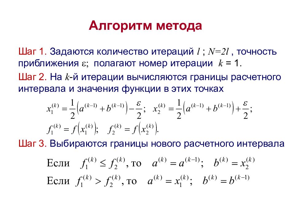 Алгоритм метода Шаг 1. Задаются количество итераций l ; N=2l, точность приближения e; полагают номер итерации k = 1. Шаг 2. На k - й итерации вычисляются границы расчетного интервала и значения функции в этих точках Шаг 3. Выбираются границы нового расчетного интервала