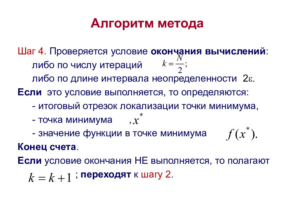 Алгоритм метода Шаг 4. Проверяется условие окончания вычислений : либо по числу итераций либо по длине интервала неопределенности 2 e. Если это условие выполняется, то определяются: - итоговый отрезок локализации точки минимума, - точка минимума, - значение функции в точке минимума Конец счета. Если условие окончания НЕ выполняется, то полагают ; переходят к шагу 2.