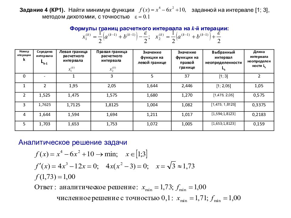 Номер итерации k Середина интервала L k-1 Левая граница расчетного интервала Правая граница расчетного интервала Значение функции на левой границе Значение функции на правой границе Выбранный интервал неопределенности L k Длина интервала неопределенности L k 0 - 1 3 5 37 [1; 3] 2 1 2 1,95 2,05 1,644 2,446 [1; 2,05 ] 1,05 2 1,525 1,475 1,575 1,680 1,270 [1,475 ; 2,05 ] 0,575 3 1, 7625 1,7125 1,8125 1,004 1,082 [1,475 ; 1,8125 ] 0,3375 4 1,644 1,594 1,694 1,211 1,017 [1,594;1,8123] 0,2183 5 1,703 1,653 1,753 1,072 1,005 [1,653;1,8123] 0,159 Задание 4 (КР1). Найти минимум функции заданной на интервале [1; 3], методом дихотомии, с точностью e = 0.1 Формулы границ расчетного интервала на k -й итерации: Аналитическое решение задачи