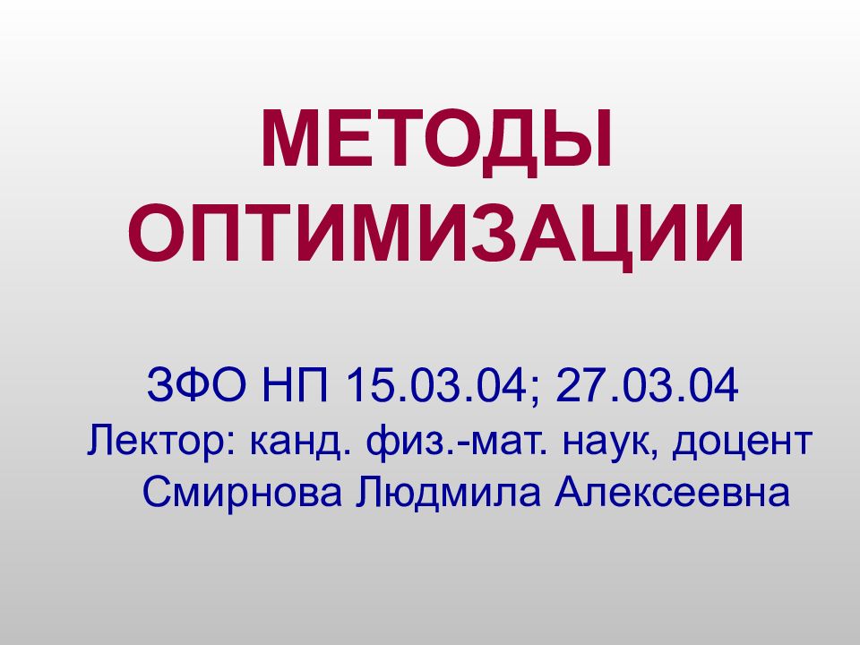 МЕТОДЫ ОПТИМИЗАЦИИ ЗФО НП 15.03.04; 27.03.04 Лектор: канд. физ.-мат. наук, доцент Смирнова Людмила Алексеевна