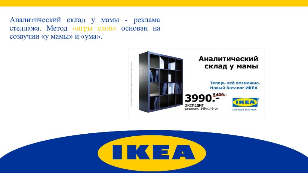 Аналитический склад у мамы - реклама стеллажа. Метод «игры слов» основан на созвучии «у мамы» и «ума».