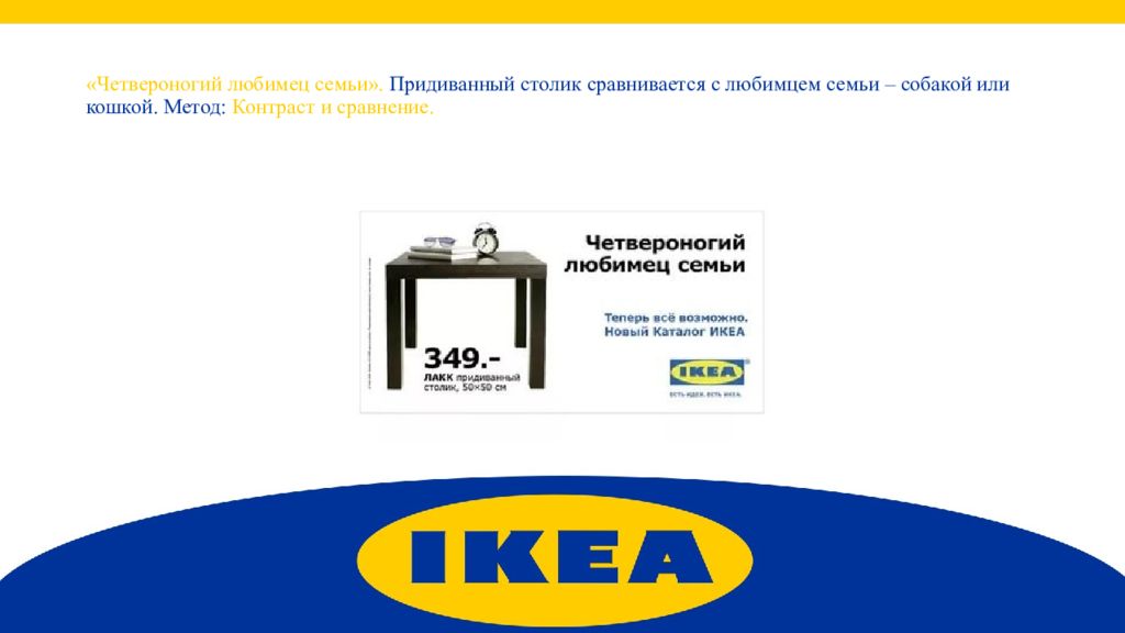 Стоит заметить, что в каталоге IKEA используются технологии 3D-рендеринга. Чтобы обыграть тот факт, что при просмотре каталога пользователи получают целостный чувственный опыт, компания создала забавную и умную рекламу, являющуюся пародией на рекламу продуктов Apple. Тем самым она использовала метод «Апелляция к уже известному». «Иногда появляются вещи, которые полностью меняют нашу жизнь»