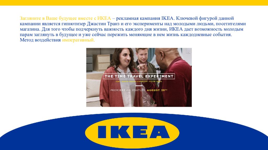 Слайд 7: Загляните в Ваше будущее вместе с ИКЕА – рекламная кампания IKEA. Ключевой фигурой данной кампании является гипнотизер Джастин Транз и его эксперименты над молодыми людьми, посетителями магазина. Для того чтобы подчеркнуть важность каждого дня жизни, ИКЕА дает возможность молодым парам заглянуть в будущее и уже сейчас пережить меняющие в нем жизнь каждодневные события. Метод воздействия императивный