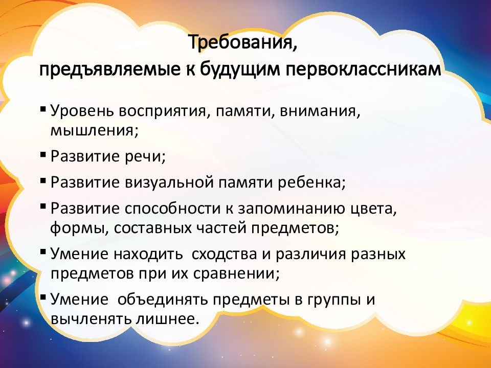 Слайд 4: Требования, предъявляемые к будущим первоклассникам