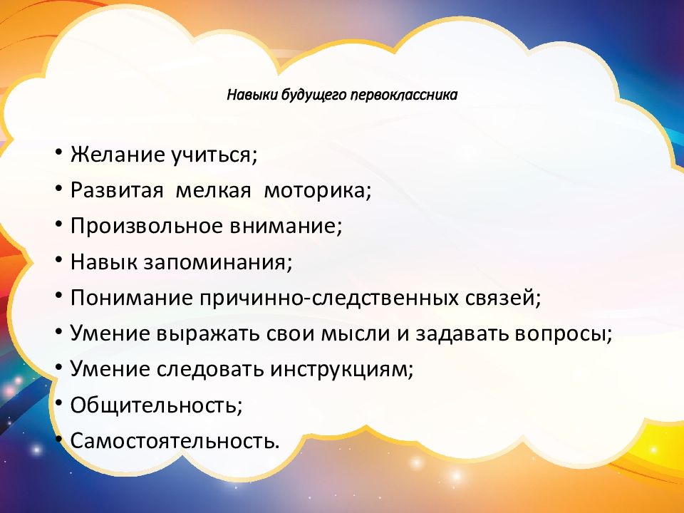 Желание учиться ; Развитая мелкая моторика; Произвольное внимание ; Навык запоминания ; Понимание причинно-следственных связей ; Умение выражать свои мысли и задавать вопросы ; Умение следовать инструкциям ; Общительность; Самостоятельность.