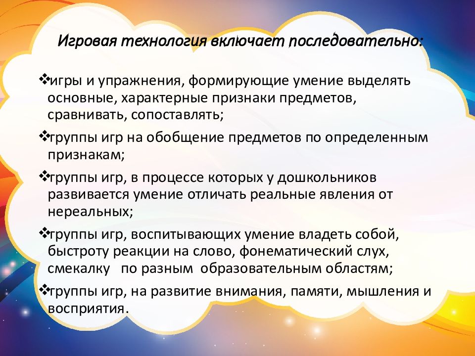 игры и упражнения, формирующие умение выделять основные, характерные признаки предметов, сравнивать, сопоставлять; группы игр на обобщение предметов по определенным признакам; группы игр, в процессе которых у дошкольников развивается умение отличать реальные явления от нереальных ; группы игр, воспитывающих умение владеть собой, быстроту реакции на слово, фонематический слух, смекалку по разным образовательным областям; группы игр, на развитие внимания, памяти, мышления и восприятия.
