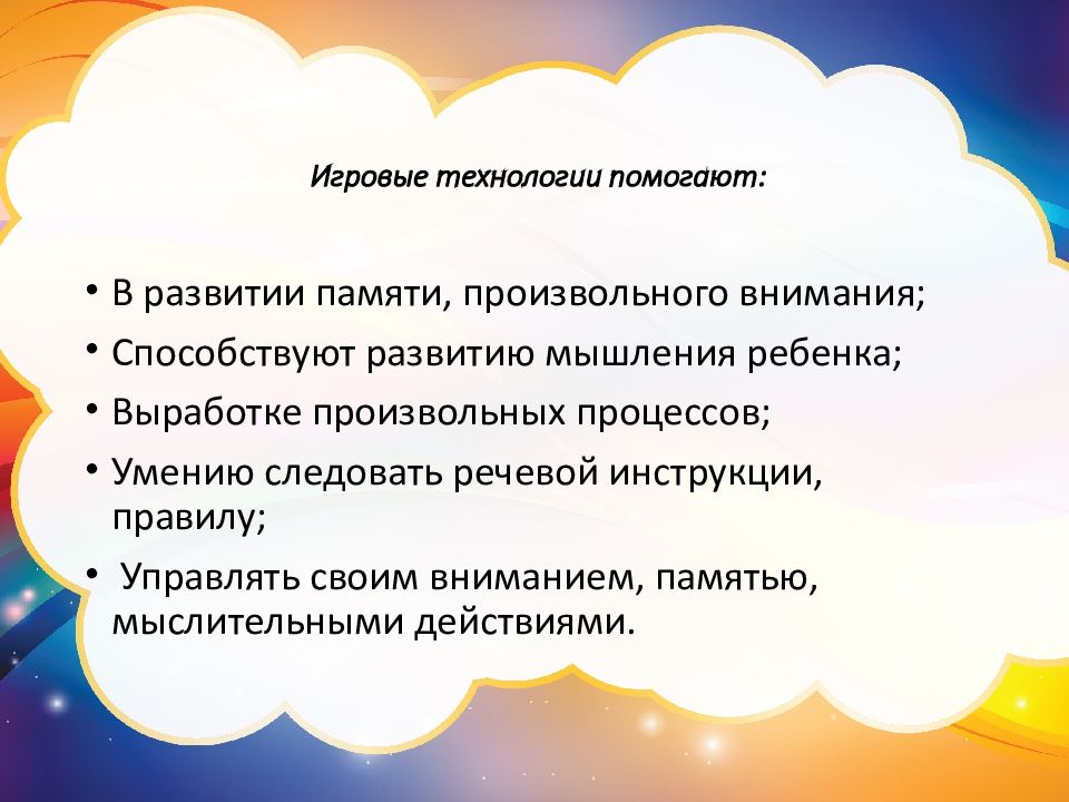 В развитии памяти, произвольного внимания; Способствуют развитию мышления ребенка; Выработке произвольных процессов; Умению следовать речевой инструкции, правилу; Управлять своим вниманием, памятью, мыслительными действиями.