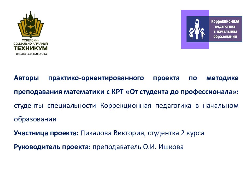 Авторы практико-ориентированного проекта по методике преподавания математики с КРТ «От студента до профессионала»: студенты специальности Коррекционная педагогика в начальном образовании Участница проекта: Пикалова Виктория, студентка 2 курса Руководитель проекта: преподаватель О.И. Ишкова