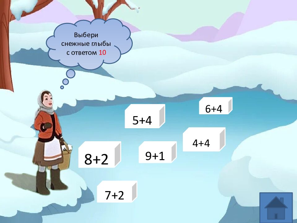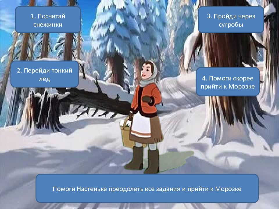 1. Посчитай снежинки 3. Пройди через сугробы 4. Помоги скорее прийти к Морозке 2. Перейди тонкий лёд Помоги Настеньке преодолеть все задания и прийти к Морозке