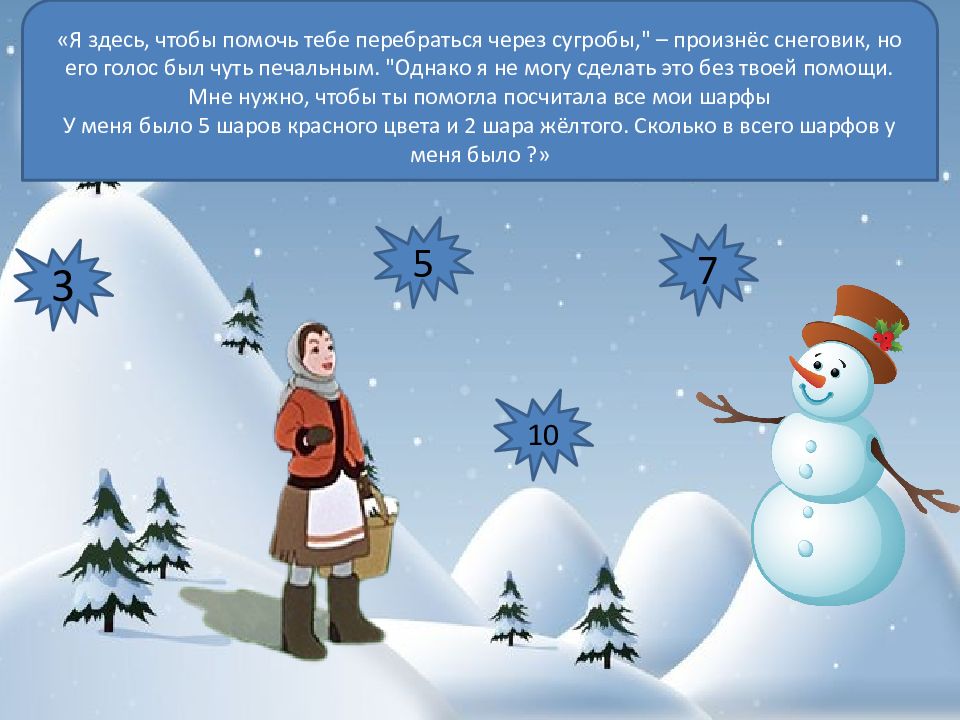 «Я здесь, чтобы помочь тебе перебраться через сугробы," – произнёс снеговик, но его голос был чуть печальным. "Однако я не могу сделать это без твоей помощи. Мне нужно, чтобы ты помогла посчитала все мои шарфы У меня было 5 шаров красного цвета и 2 шара жёлтого. Сколько в всего шарфов у меня было ?» 7 10 5 3