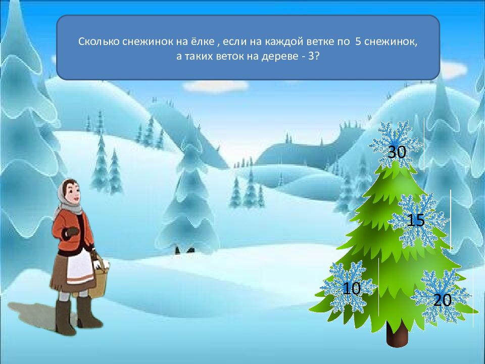 Сколько снежинок на ёлке, если на каждой ветке по 5 снежинок, а таких веток на дереве - 3? 15 20 30 10 . . .