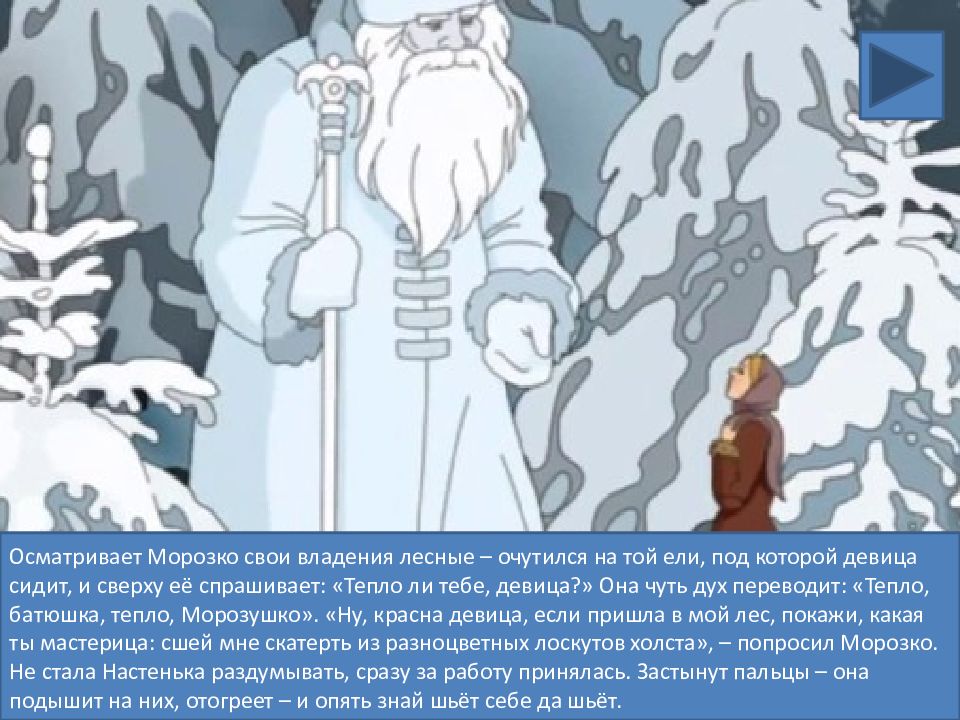Осматривает Морозко свои владения лесные – очутился на той ели, под которой девица сидит, и сверху её спрашивает: «Тепло ли тебе, девица?» Она чуть дух переводит: «Тепло, батюшка, тепло, Морозушко ». «Ну, красна девица, если пришла в мой лес, покажи, какая ты мастерица: сшей мне скатерть из разноцветных лоскутов холста», – попросил Морозко. Не стала Настенька раздумывать, сразу за работу принялась. Застынут пальцы – она подышит на них, отогреет – и опять знай шьёт себе да шьёт.