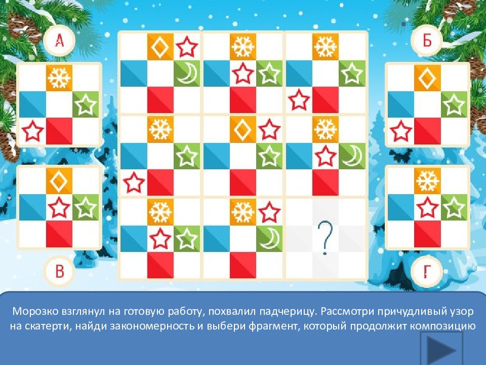 Морозко взглянул на готовую работу, похвалил падчерицу. Рассмотри причудливый узор на скатерти, найди закономерность и выбери фрагмент, который продолжит композицию .. . ..