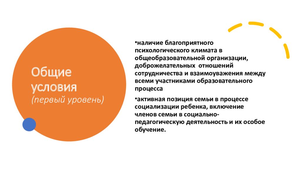 наличие благоприятного психологического климата в общеобразовательной организации, доброжелательных отношений сотрудничества и взаимоуважения между всеми участниками образовательного процесса активная позиция семьи в процессе социализации ребенка, включение членов семьи в социально-педагогическую деятельность и их особое обучение.