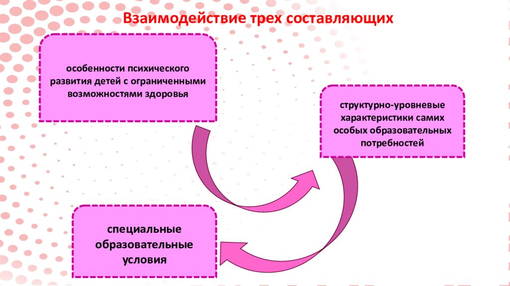 Взаимодействие трех составляющих особенности психического развития детей с ограниченными возможностями здоровья структурно-уровневые характеристики самих особых образовательных потребностей специальные образовательные условия