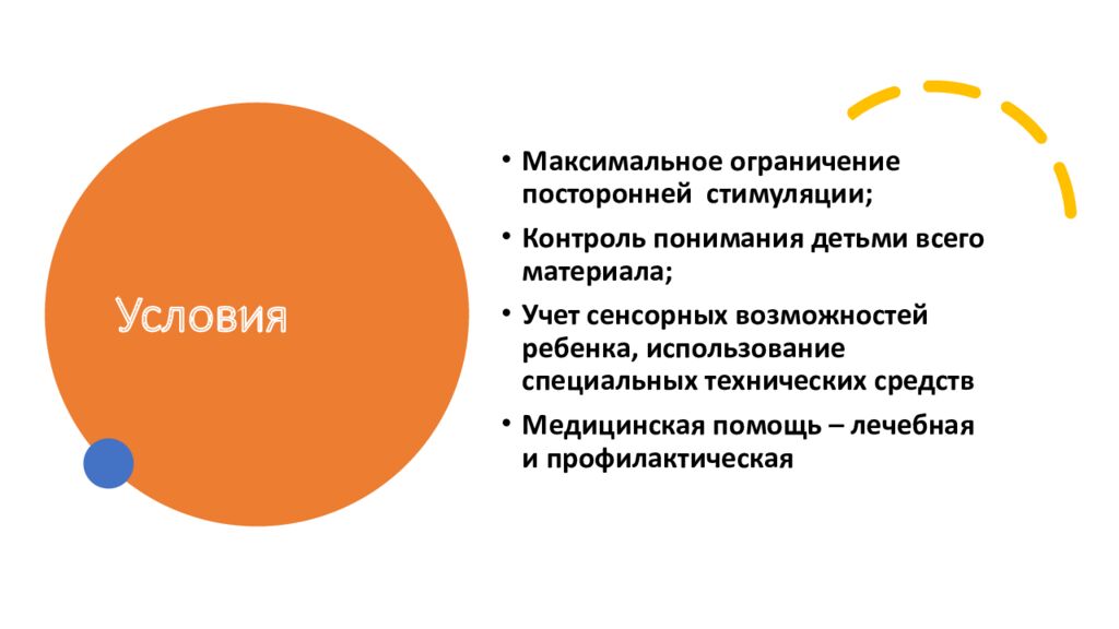Максимальное ограничение посторонней стимуляции ; Контроль понимания детьми всего материала ; Учет сенсорных возможностей ребенка, использование специальных технических средств Медицинская помощь – лечебная и профилактическая