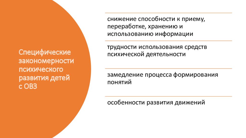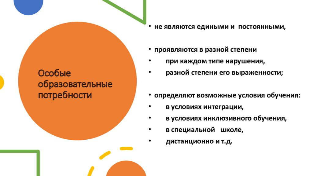 не являются едиными и постоянными, проявляются в разной степени при каждом типе нарушения, разной степени его выраженности ; определяют возможные условия обучения : в условиях интеграции, в условиях инклюзивного обучения, в специальной школе, дистанционно и т.д.