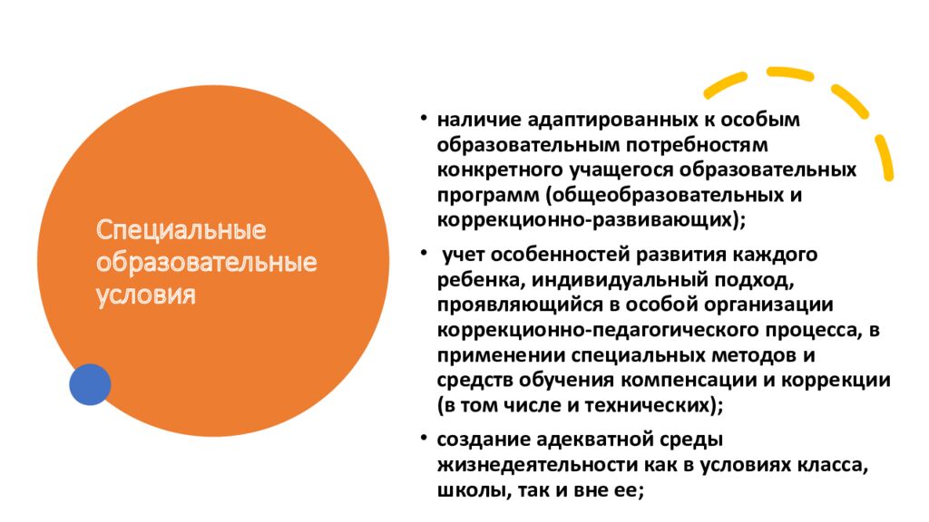наличие адаптированных к особым образовательным потребностям конкретного учащегося образовательных программ ( общеобразовательных и коррекционно-развивающих ); учет особенностей развития каждого ребенка, индивидуальный подход, проявляющийся в особой организации коррекционно-педагогического процесса, в применении специальных методов и средств обучения компенсации и коррекции (в том числе и технических ); создание адекватной среды жизнедеятельности как в условиях класса, школы, так и вне ее ;