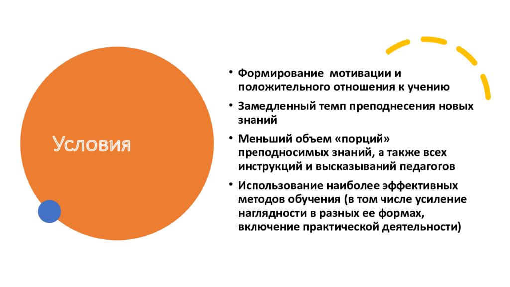 Формирование мотивации и положительного отношения к учению Замедленный темп преподнесения новых знаний Меньший объем « порций » преподносимых знаний, а также всех инструкций и высказываний педагогов Использование наиболее эффективных методов обучения (в том числе усиление наглядности в разных ее формах, включение практической деятельности )