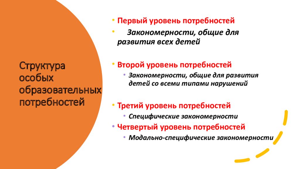 Первый уровень потребностей Закономерности, общие для развития всех детей Второй уровень потребностей Закономерности, общие для развития детей со всеми типами нарушений Третий уровень потребностей Специфические закономерности Четвертый уровень потребностей Модально-специфические закономерности