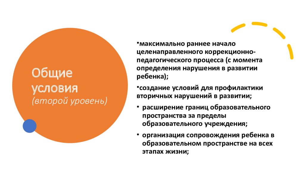 максимально раннее начало целенаправленного коррекционно-педагогического процесса (с момента определения нарушения в развитии ребенка ); создание условий для профилактики вторичных нарушений в развитии ; расширение границ образовательного пространства за пределы образовательного учреждения ; организация сопровождения ребенка в образовательном пространстве на всех этапах жизни ;