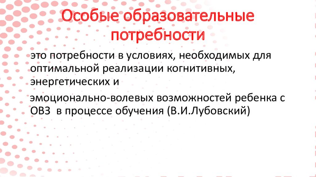 это потребности в условиях, необходимых для оптимальной реализации когнитивных, энергетических и эмоционально-волевых возможностей ребенка с ОВЗ в процессе обучения ( В.И.Лубовский )