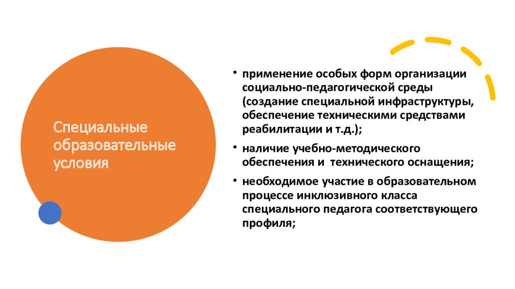 применение особых форм организации социально-педагогической среды ( создание специальной инфраструктуры, обеспечение техническими средствами реабилитации и т.д.); наличие учебно-методического обеспечения и технического оснащения ; необходимое участие в образовательном процессе инклюзивного класса специального педагога соответствующего профиля ;