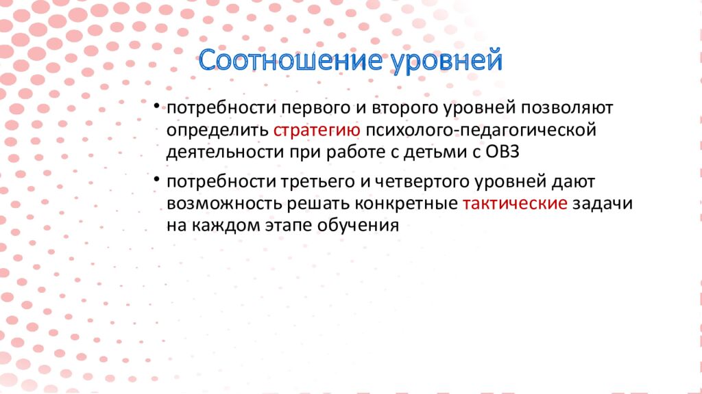 потребности первого и второго уровней позволяют определить стратегию психолого-педагогической деятельности при работе с детьми с ОВЗ потребности третьего и четвертого уровней дают возможность решать конкретные тактические задачи на каждом этапе обучения
