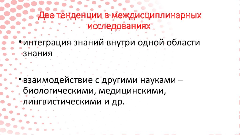 интеграция знаний внутри одной области знания взаимодействие с другими науками – биологическими, медицинскими, лингвистическими и др.