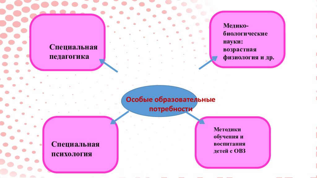 Особые образовательные потребности Медико-биологические науки: возрастная физиология и др. Специальная педагогика C пециальная психология Методики обучения и воспитания детей с ОВЗ