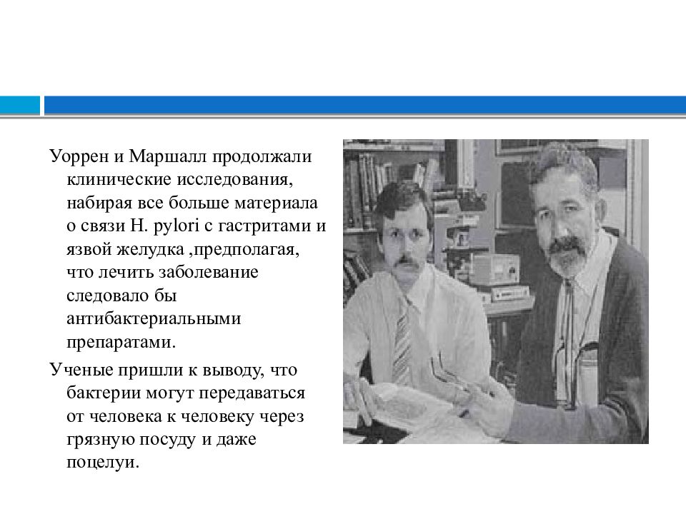 Уоррен и Маршалл продолжали клинические исследования, набирая все больше материала о связи H. pylori с гастритами и язвой желудка,предполагая, что лечить заболевание следовало бы антибактериальными препаратами. Ученые пришли к выводу, что бактерии могут передаваться от человека к человеку через грязную посуду и даже поцелуи.