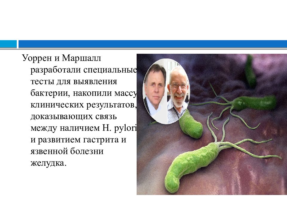 Уоррен и Маршалл разработали специальные тесты для выявления бактерии, накопили массу клинических результатов, доказывающих связь между наличием H. pylori и развитием гастрита и язвенной болезни желудка.