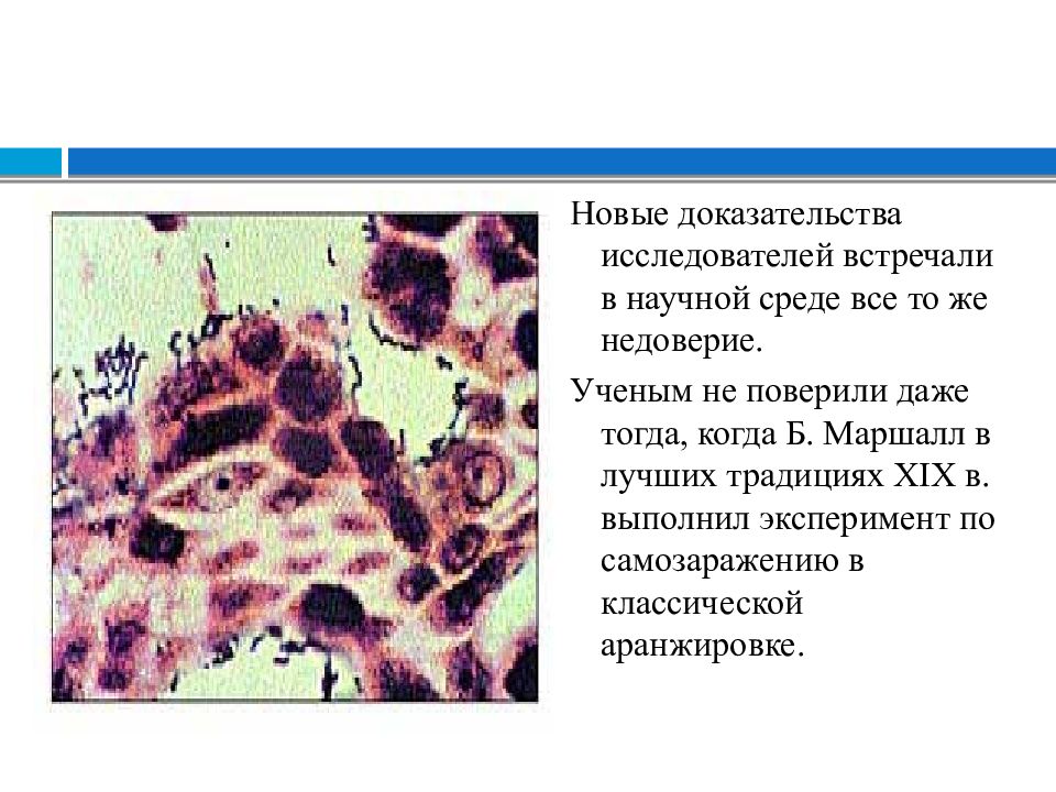 Новые доказательства исследователей встречали в научной среде все то же недоверие. Ученым не поверили даже тогда, когда Б. Маршалл в лучших традициях XIX в. выполнил эксперимент по самозаражению в классической аранжировке.