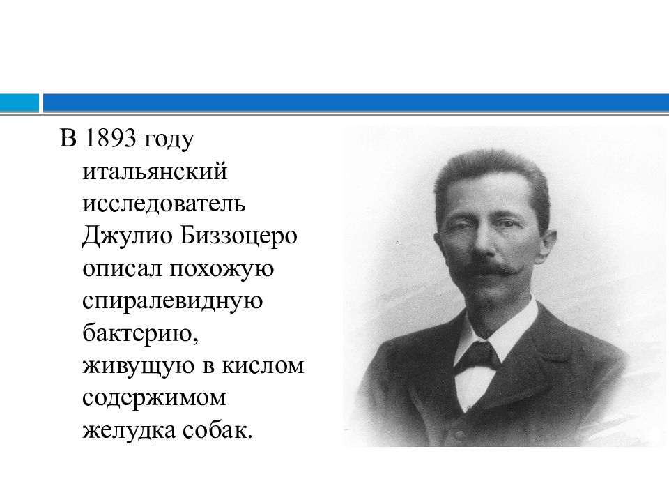 В 1893 году итальянский исследователь Джулио Биззоцеро описал похожую спиралевидную бактерию, живущую в кислом содержимом желудка собак.